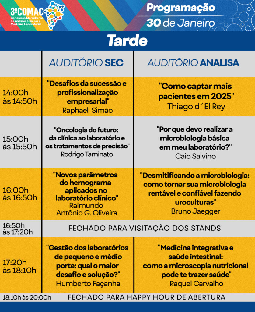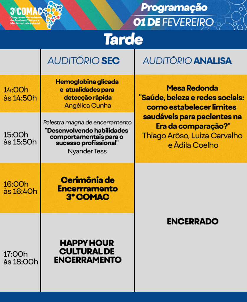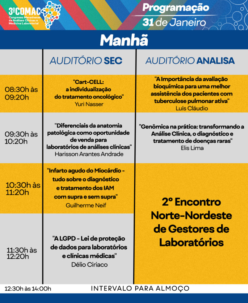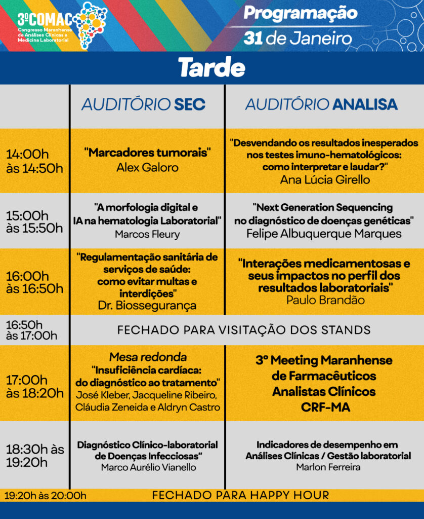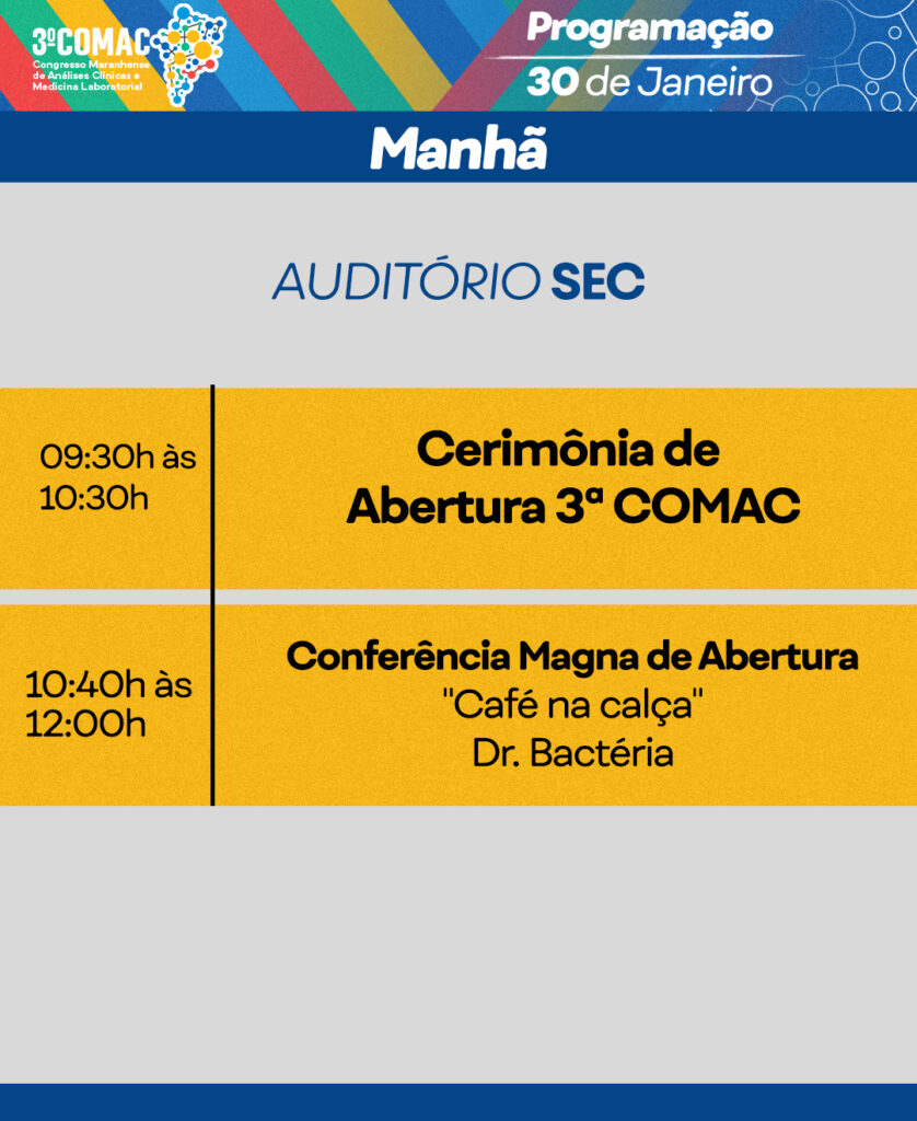 O 3º Congresso Maranhense de Análises Clínicas e Medicina Laboratorial – COMAC ocorrerá nos dias 30 e 31 de janeiro e 01 de fevereiro de 2025.